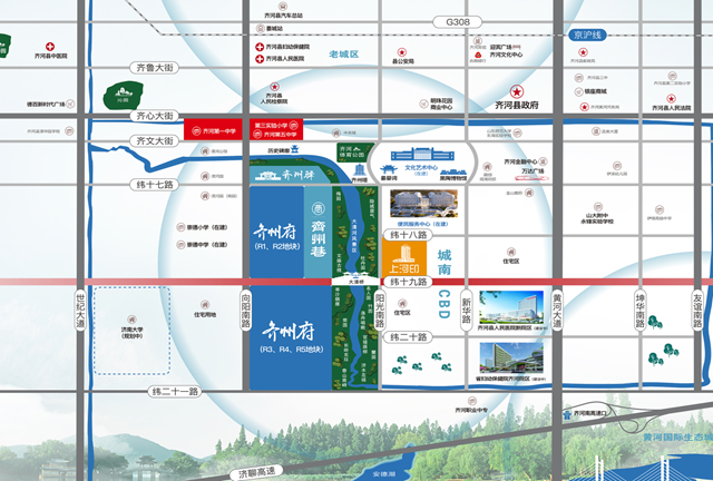 配套强:自建约20万方商业,涵盖古韵商街、河畔豪宅、金融商务、品牌酒店,打造吃喝玩乐购一站式商业配套;自建六班制幼儿园,临近齐河一中、齐河五中、第三实验小学、齐河三中等优质教育,家门口即享一站式菁英教育;